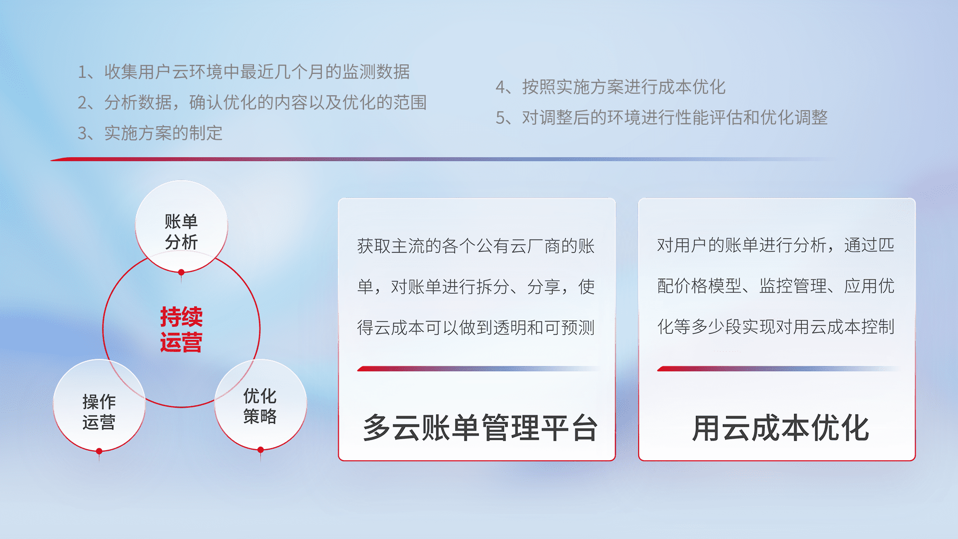 通过多云纳管,,以统一的资源数据模型把客户的云资源进行抽象和封装,,进而实现对多云资源的统一操作,,,,保障云资源管理的可靠性、、稳定性与可用性。。。。量身定制化运维内容,,,,配置、、、开发运维、、、补丁管理、、备份、、监控、、、、认证和访问管理、、、、审计和日常巡检等,,,,保障在用云过程中的可靠度,,,稳定度以及高可用率。。。。